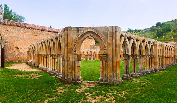 El claustro está al aire libre, sin techo. Perteneció a un monasterio sanjuanista-hospitalario cuya iglesia está al lado en la que destacan dos templetes de sabor oriental. Los entrecruzados arcos son de influencia mudéjar, únicos en toda España.